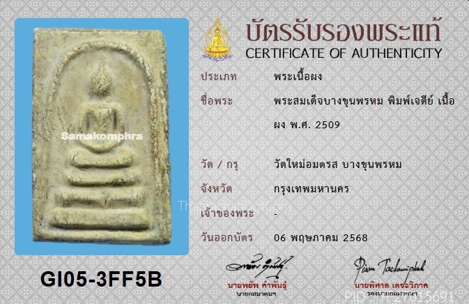 พระสมเด็จบางขุนพรหม พิมพ์เจดีย์ ปี 2509 พร้อมบัตรรับรองสมาคม