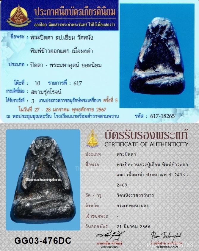 พระปิดตา หลวงปู่เอี่ยม วัดหนังฯ พิมพ์สังฆาฏิ+บัตรสมาคม