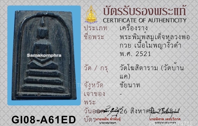 พระสมเด็จหลวงพ่อกวย วัดโฆษิตาราม เนื้อไม้พญางิ้วดำ