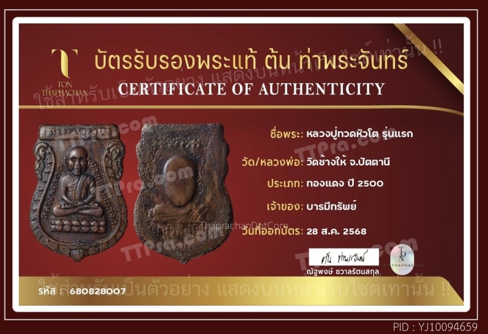 ปิดตาหลวงพ่อทับ วัดอนงค์ บัตรสมาคม