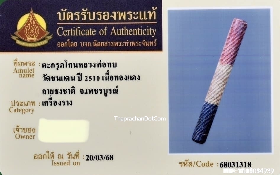 ตะกรุดโทนหลวงพ่อทบ วัดชนแดน ถักเชือก ลายธงชาติ