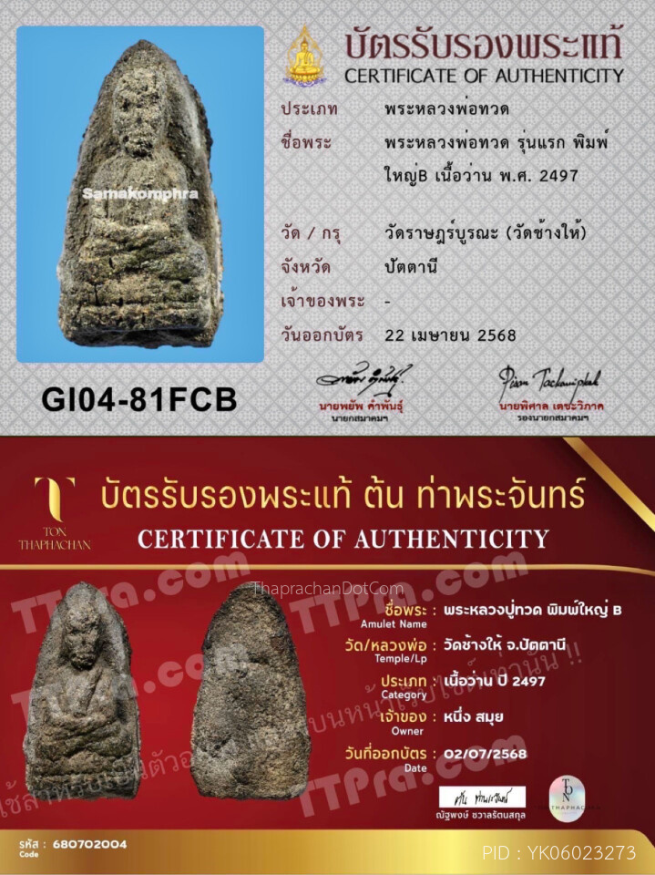 พระหลวงพ่อทวด รุ่นแรกปี 2497 เนื้อว่าน พิมพ์ใหญ่ B