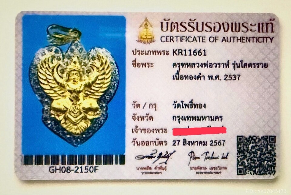 พญาครุฑอ.วราห์ วัดโพธิ์ทอง รุ่นล้างอาถรรพ์ เนื้อทองคำลงยา
