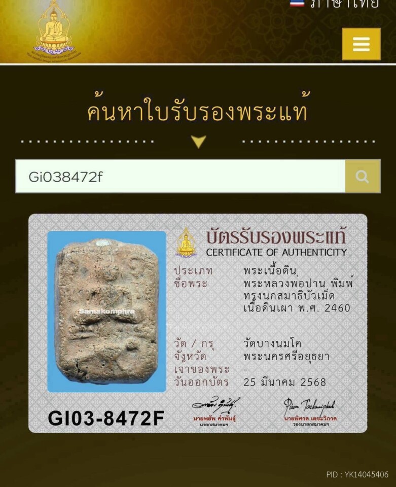 หลวงพ่อปาน พิมพ์ทรงนกสมาธิบัวเม็ด เนื้อดินเผา พ.ศ. 2460