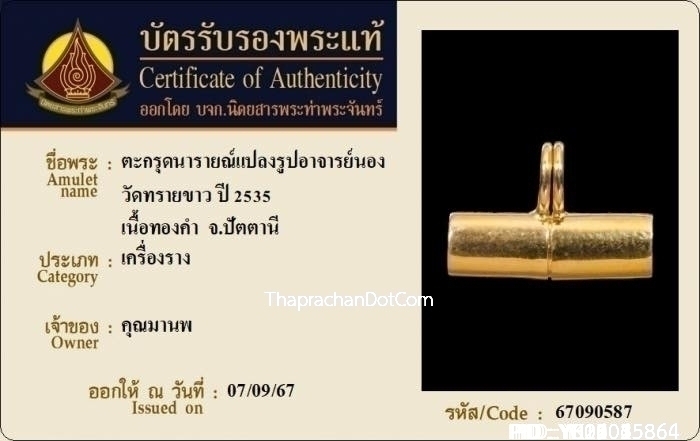 ตะกรุดนารายณ์แปลงรูปอาจารย์นอง วัดทรายขาว เนื้อทองคำ
