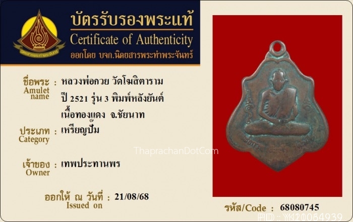 เหรียญหลวงพ่อกวย วัดโฆษิตาราม รุ่น3 หลังยันต์ ปี2521