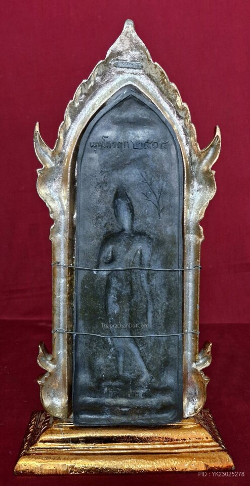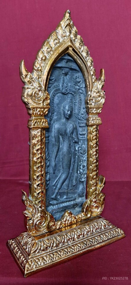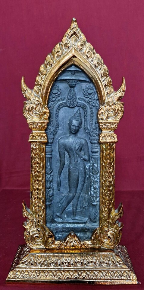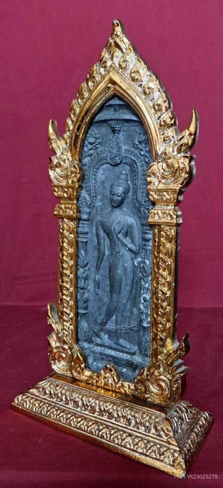 พระลีลากำแพงศอก หลวงพ่อขอม พร้อมกรอบและฐานหล่อกะไหล่ทอง
