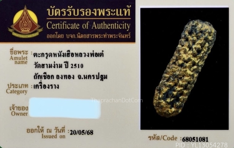 ตะกรุดหนังหน้าผากเสือ หลวงพ่อเต๋ วัดสามง่าม จ.นครปฐม