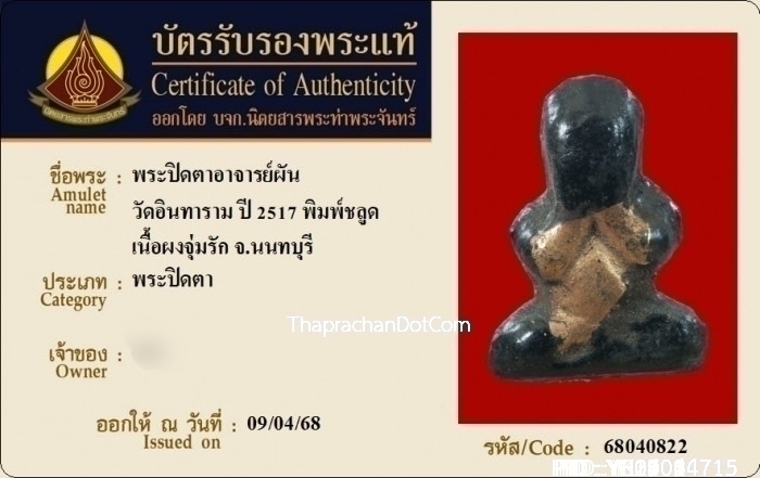 พระปิดตาอาจารย์ผัน วัดอินทาราม พิมพ์ชลูด ปี2517