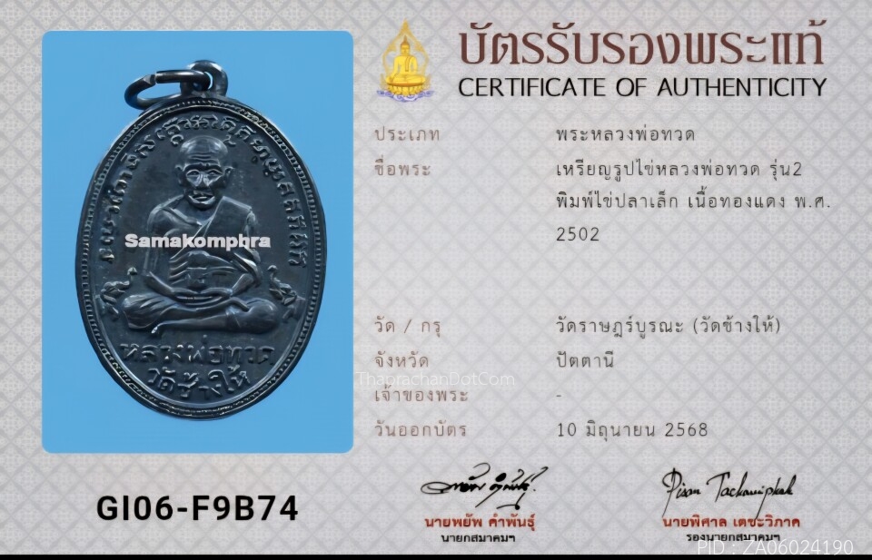 เหรียญรูปไข่ หลวงปู่ทวด รุ่นสอง ไข่ปลาเล็ก แช้มป์ TOT 2559