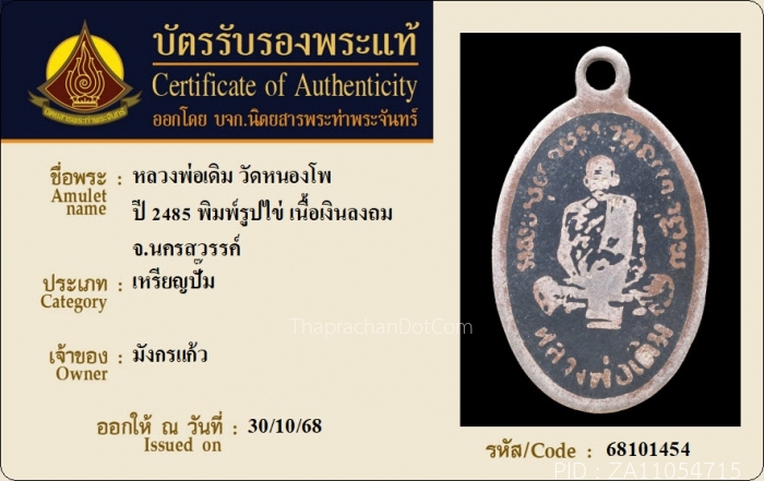 รูปเหมือนปั๊มหลวงพ่อเดิม วัดหนองโพ เนื้อตะกั่ว ปี2482