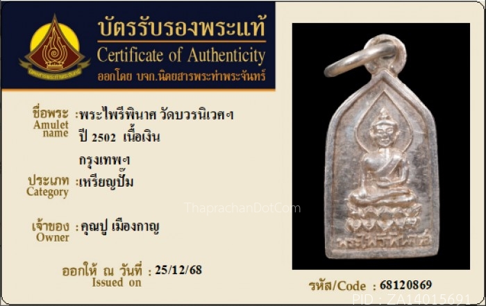 พระนางพญา เจ้าคุณศรี(สนธิ์) วัดสุทัศน์ ปี2485+บัตรสมาคม