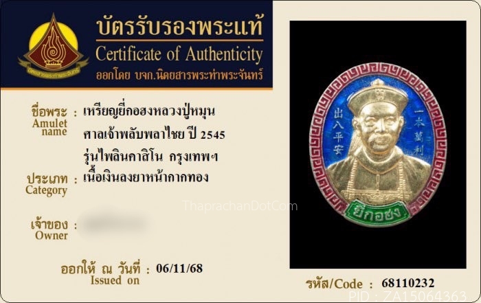 เหรียญยี่กอฮงรุ่นไพลินคาสิโน เนื้อเงินลงยา ปี2545