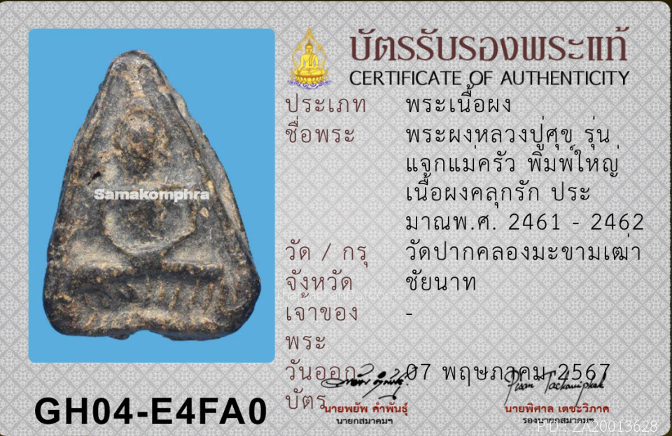 หลวงปู่ศุข วัดปากคลองมะขามเฒ่า พิมพ์วัดหัวหาด ชะลูด