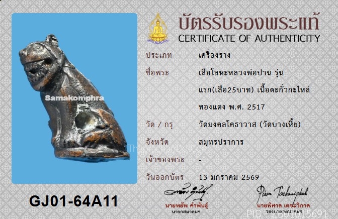 เสือโลหะหลวงพ่อปาน รุ่นแรก(เสือ 25 บาท) ปี2517+บัตรสมาคม