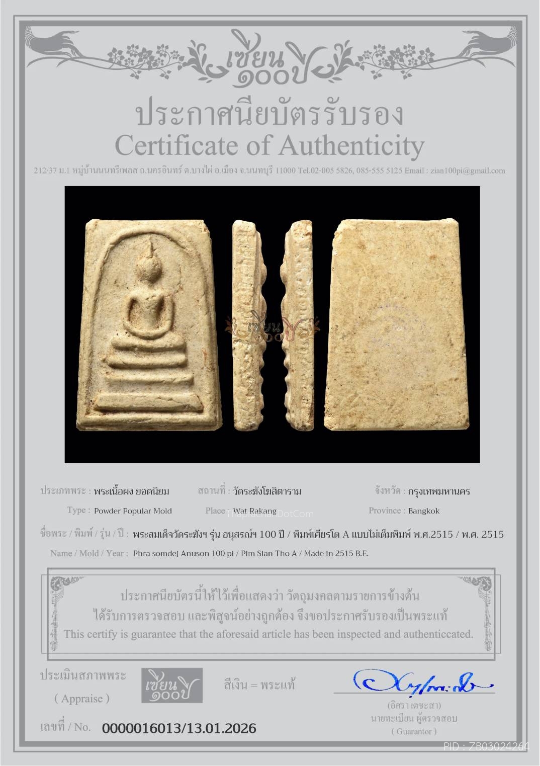 พระวัดพลับ พิมพ์พุงป่องเล็ก เนื้อผง พ.ศ.2380 พร้อมบัตรสมาคม