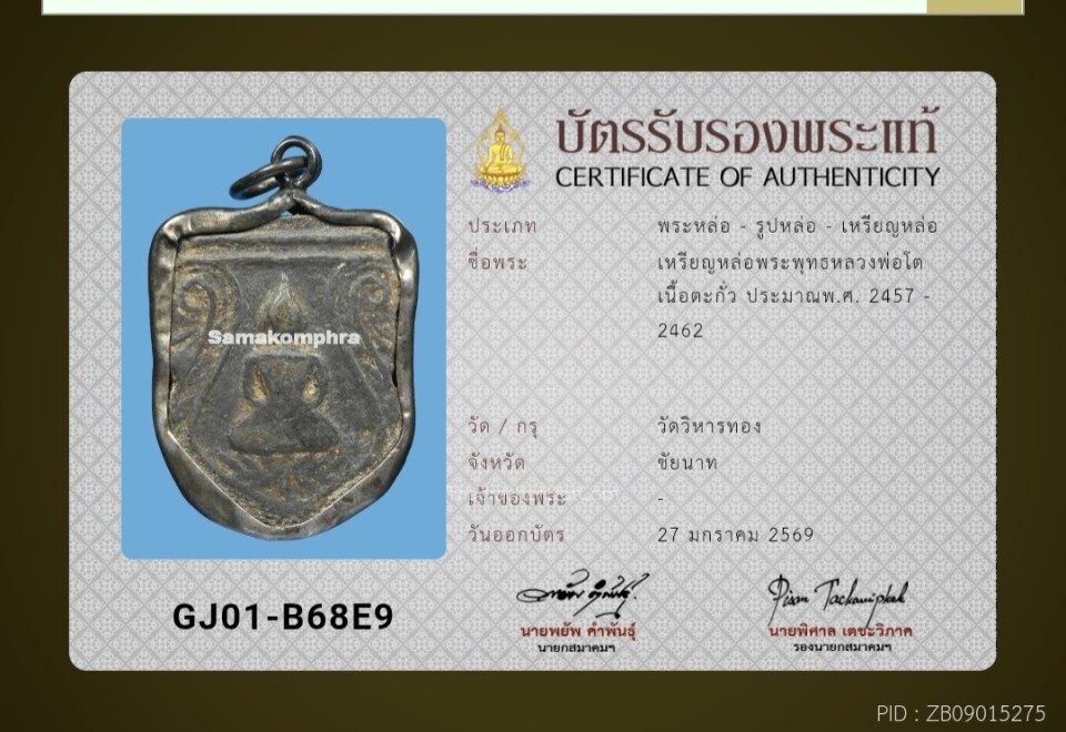 พระปิดตาหลวงพ่อทับ วัดสุวรรณาราม(วัดทอง) บัตรสมาคม