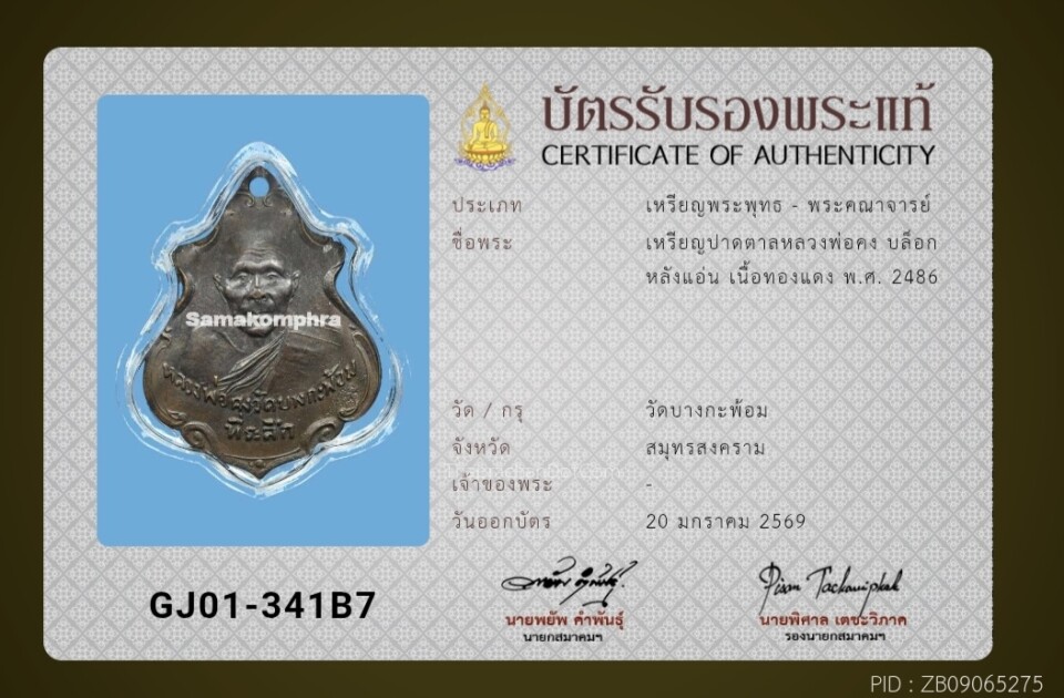 เหรียญหลวงพ่อคง วัดบางกะพ้อม ปี2483 หลังแอ่น บัตรสมาคม