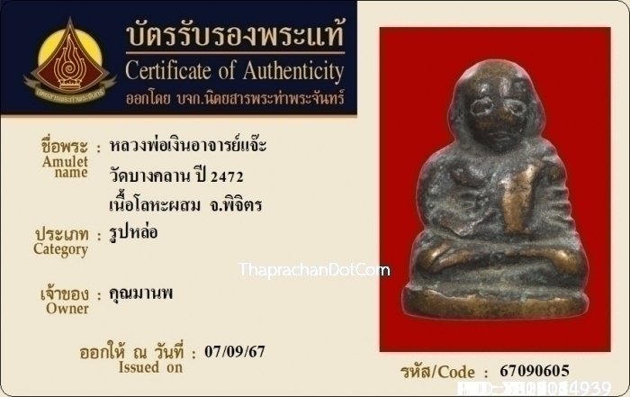 หลวงพ่อเงิน วัดบางคลาน อาจารย์แจ๊ะ เนื้อโลหะผสม ปี2472