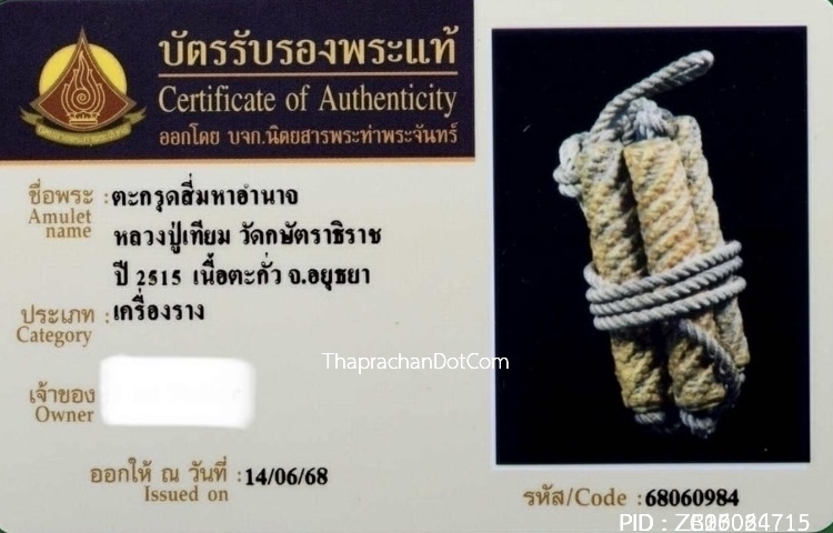 ตะกรุดสี่มหาอำนาจหลวงปู่เทียม วัดกษัตราธิราช อยุธยา