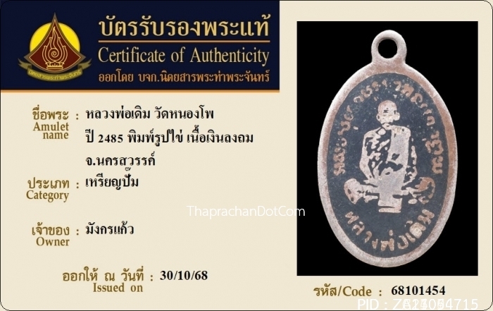 รูปเหมือนปั๊มหลวงพ่อเดิม วัดหนองโพ เนื้อตะกั่ว ปี2482