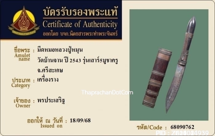 มีดหมอมหาปราบ หลวงปู่หมุน ฐิตสีโล วัดบ้านจาน ปี2543