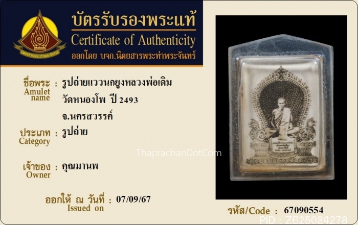 รูปถ่ายหลวงพ่อเดิม แววนกยูง หลังยันต์ ปี2493