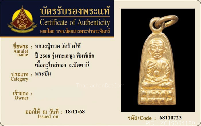 พระหลวงพ่อทอง วัดเขาตะเครา เนื้อทองคำ ปี2528 จ.เพรชบุรี