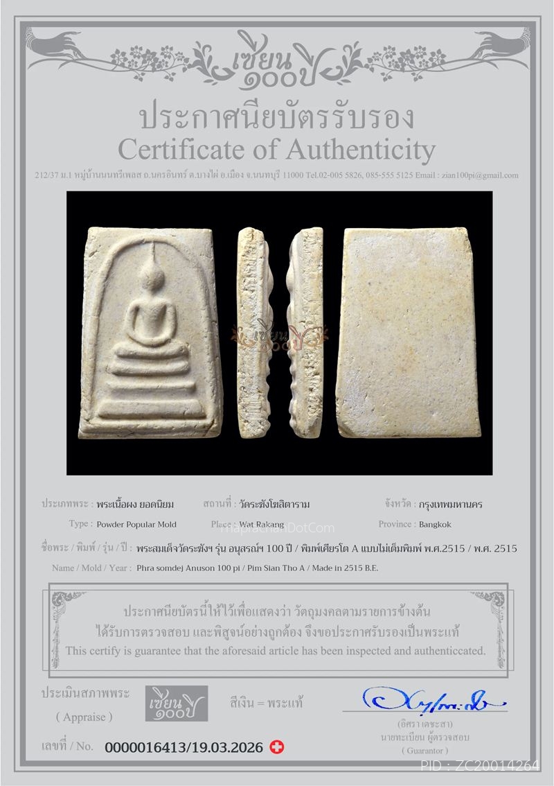 สมเด็จวัดระฆัง 100 ปี พิมพ์ฟอร์มเศียรโตสวย พร้อมบัตรทองชมรม2
