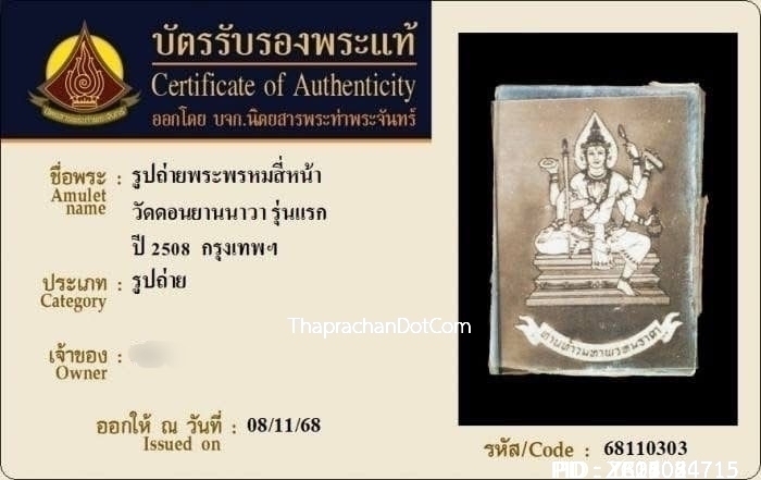 รูปถ่ายพระพรหมสี่หน้า วัดดอนยานนาวา รุ่นแรก ปี 2508