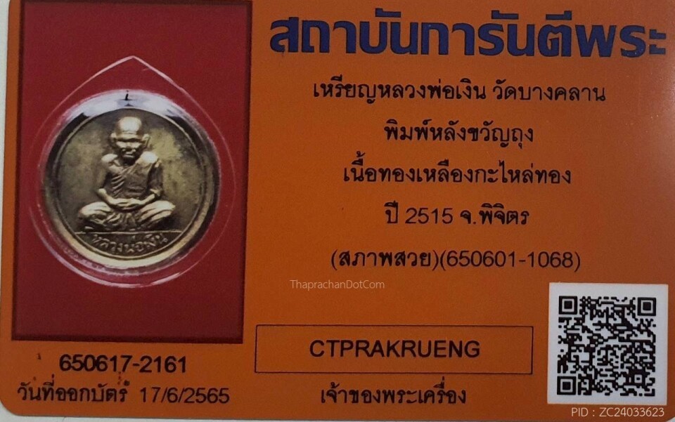เหรียญกลม หลวงพ่อเงิน พิมพ์หลังขวัญถุง วัดบางคลาน ปี2515