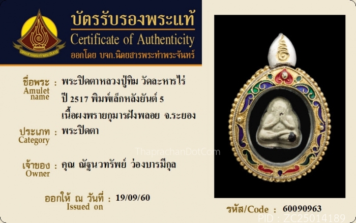พระปิดตาฝังพลอย(ฝังทับทิม) หลังยันต์ห้า หลวงปู่ทิม ปี2517