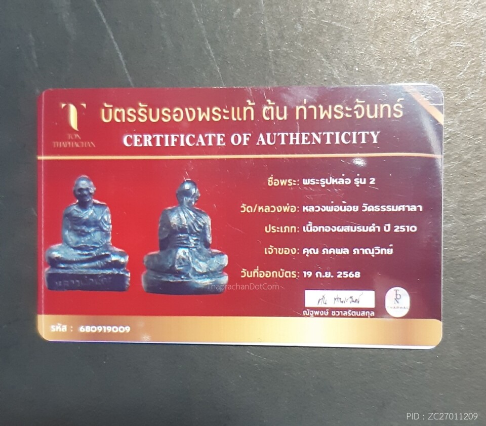 พระพุทธชินราชหลวงพ่อเกิด วัดทัพหลวงปี2482นครปฐม+บัตร
