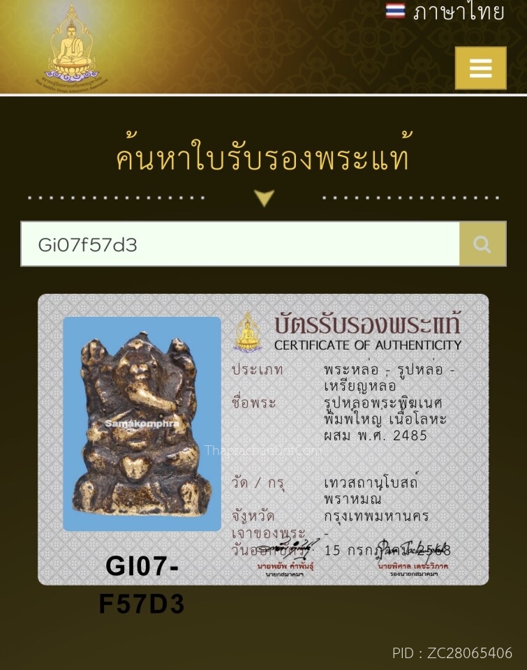 พระพิฆเนศ พิมพ์ใหญ่ เนื้อโลหะผสม พ.ศ.2485