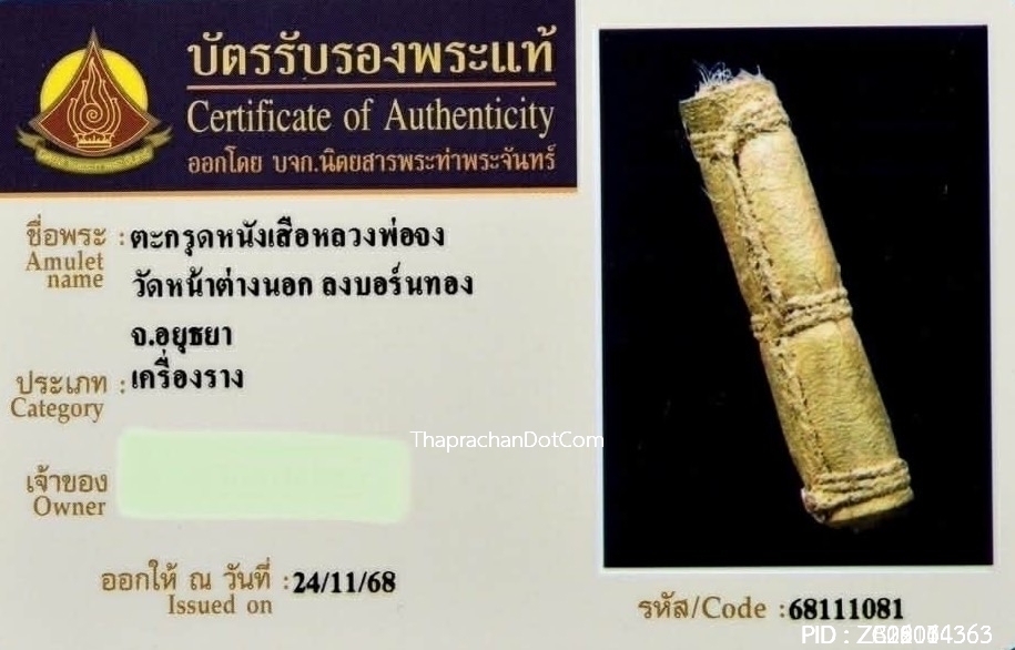 ตะกรุดหนังหน้าผากเสือ หลวงพ่อจง วัดหน้าต่างนอก