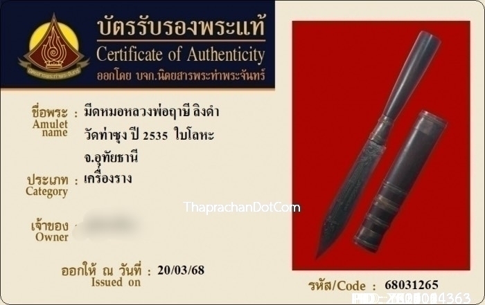 มีดหมอชาตรีหลวงพ่อฤาษีลิงดำ วัดท่าซุง จ.อุทัยธานี ปี2535