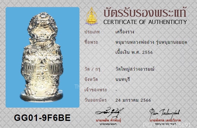 หนุมานหลวงพ่ออ่าง เนื้อเงิน วัดใหญ่สว่างอารมณ์+บัตรสมาคม