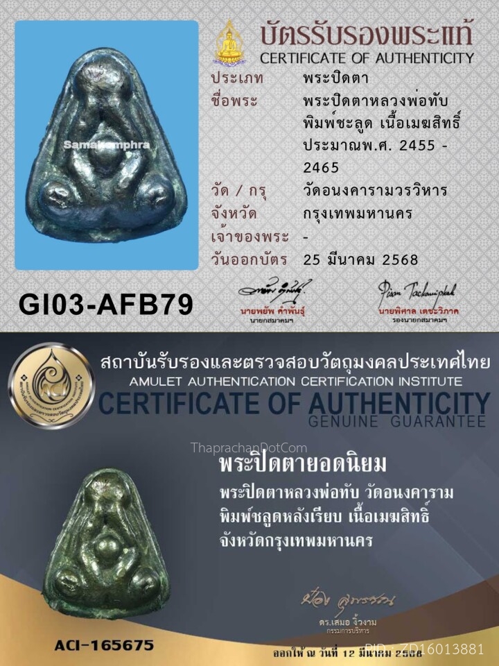 พระปิดตาเมฆสิทธิ์ หลวงพ่อทับ วัดอนงคาราม พิมพ์ชะลูดไม่แต่ง