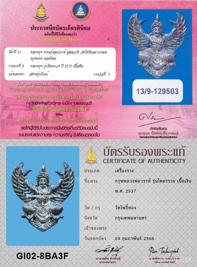 หลวงพ่อปาน วัดบางนมโค พิมพ์ครุฑผีเสื้อ พร้อมทอง+บัตรรับรอง