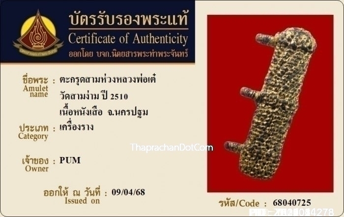 ตะกรุดหนังหน้าผากเสือ หลวงพ่อเต๋ วัดสามง่าม จ.นครปฐม