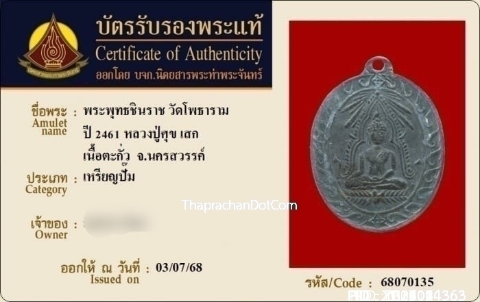 เหรียญพระพุทธชินราช วัดโพธาราม เนื้อตะกั่ว ปี2461