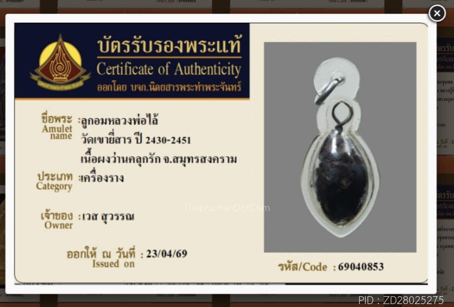 พระปิดตาหลวงพ่อทับ วัดสุวรรณาราม(วัดทอง) บัตรสมาคม