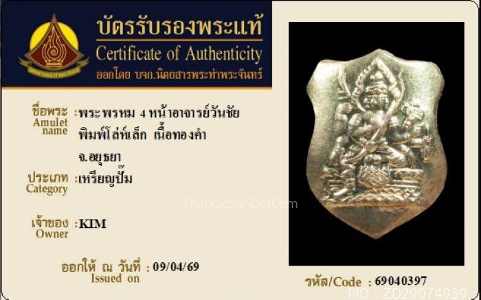 เหรียญพระพรหมโล่ห์เล็ก หลวงปู่สีห์ วัดสะแก เนื้อทองคำ